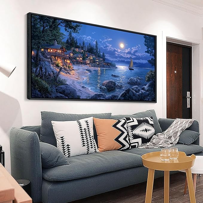 CHATYOUNG Coastal Living Room Wall Art, Large Blue Ocean Moon Night Seashore Canvas Black Framed Wall Pictures Modern Artwork Wall Painting for Bedroom Living Room Kitchen Home Office Decor 29x58 IN
