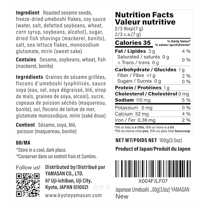 YAMASAN KYOTO UJI Japanese Umeboshi Furikake Seasoning, Sesame-Soy Marinade, Freeze-dried Sour Plum Flakes, Delicious Flavor of Various Foods, Made in Japan, 100g (3.5oz)