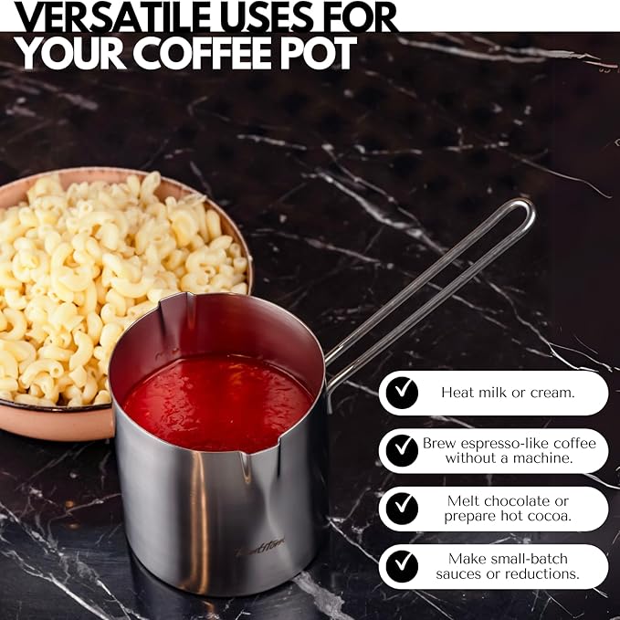 - 🔥 SAFE HANDLE & STOVETOP COMPATIBLE The heat-resistant handle stays cool while brewing, ensuring safe use on gas, electric, and induction cooktops. Ideal as a milk warmer pot, coffee boiler, or stovetop milk frother—your multi-purpose kitchen essential.