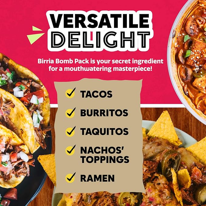 - VERSATILE INGREDIENT - From tacos to burritos, nachos to quesadillas, the Birria Bomb enhances all your favorite dishes. It's your all-in-one secret ingredient for a variety of delicious Mexican meals, easily adapted for stovetop, slow cooker, or pressure cooker preparation.