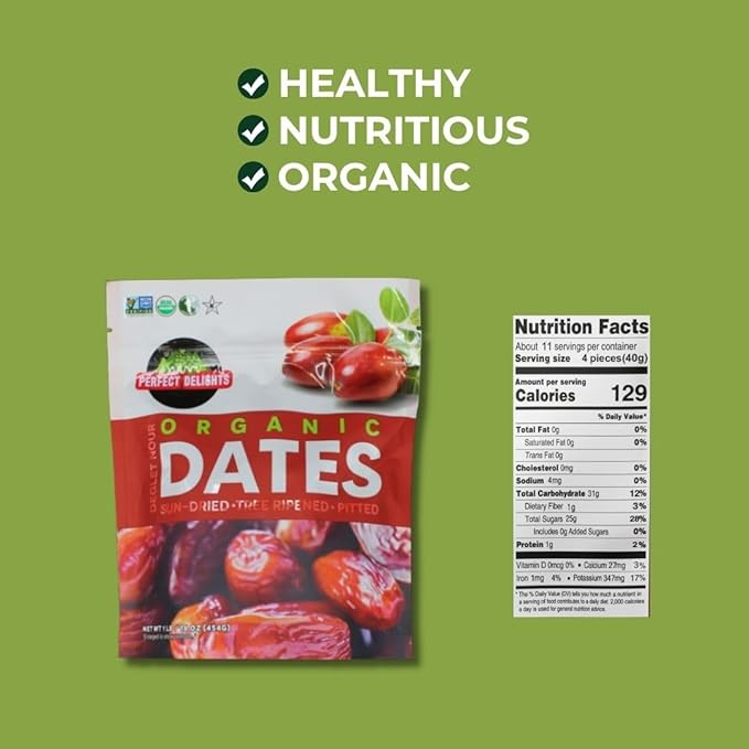 - Naturally Good: With Organic, non-GMO, Kosher and Halal certifications, Perfect Delights sun-dried dates are a healthy choice for any diet.