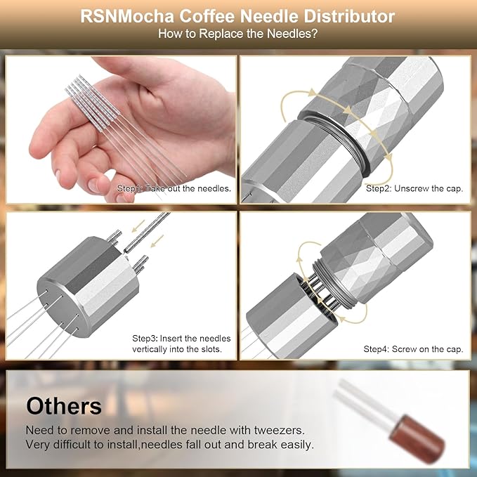- 【DIY Needles】This coffee needle distributor package contains 12 x Φ0.25mm stainless steel needles, 6 are already installed and 6 for spare use. RSNMocha espresso accessories can be easily assemble/disassemble,it is convenient for comprehensive cleaning.