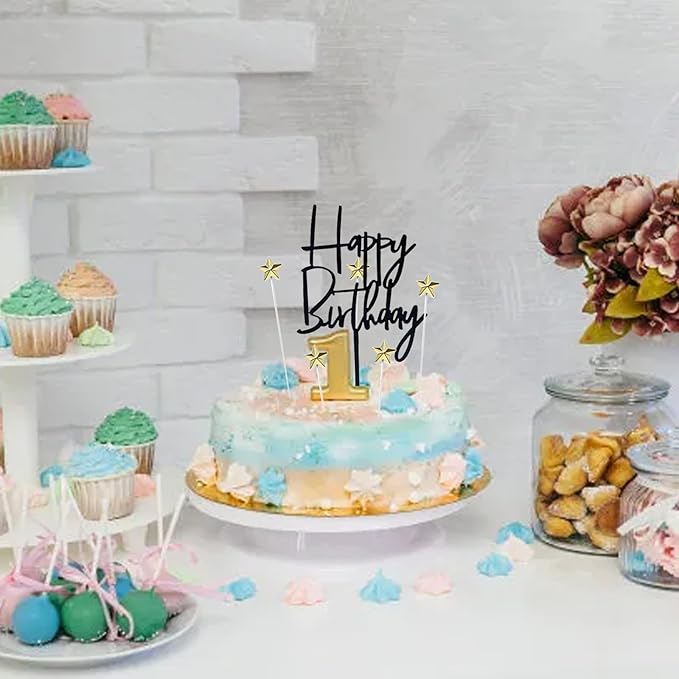 ZHENGYE Set of 1 Black Acrylic Happy birthday Cake Topper And 5 pcs glod Star Cupcake Topper Cake Decoration Supplies for Baby Shower Birthday Decorations(Black 15)