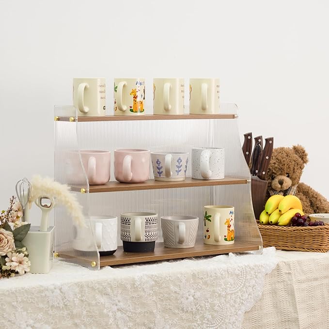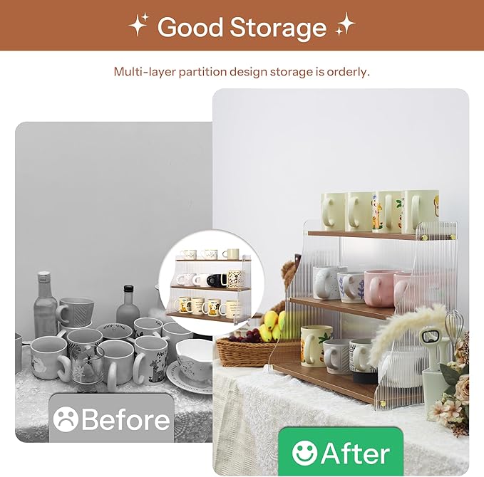 - 3-Tier Space-Saving Solution Wooden Cup Holder: 19.9*7.8*15.8 inch. The Wooden Coffee Cup Holder is designed to efficiently organize coffee cups. Optimize countertops with open shelves designed to hold mugs, coffee bar accessories, plants, or decor. Lightweight yet sturdy, it organizes clutter while displaying items with easy-access visibility.Whether it's your kitchen, office, or cafe, it will help you maintain a neat and tidy environment., with each tier spaced to ensure stability and ease of access.
