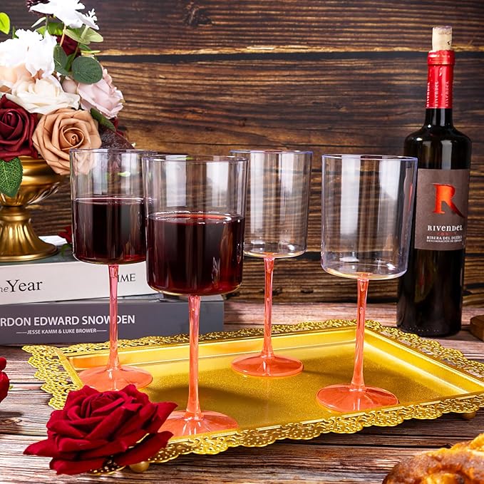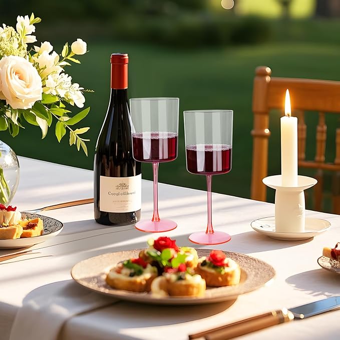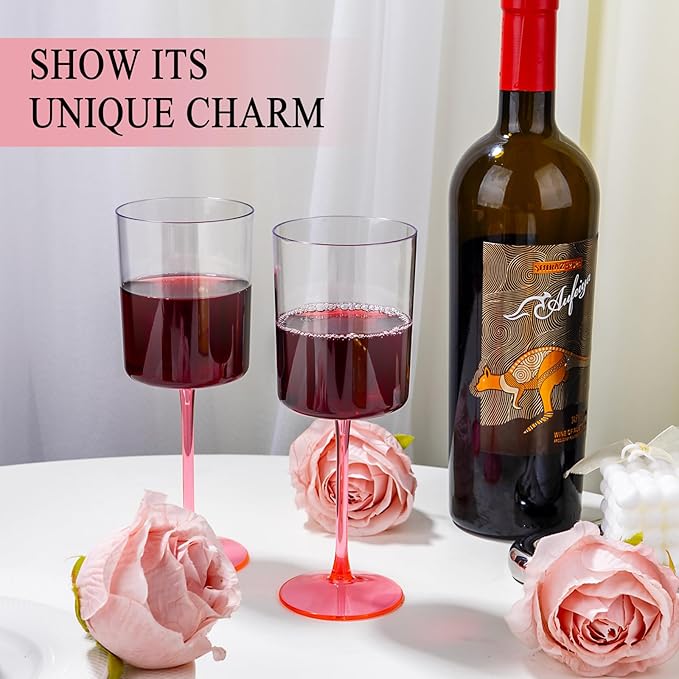 - WIDELY USED: Plastic stemmed wine glasses are suitable for outdoor, party, wedding, barbecue, picnic or car. The limousine industry has transitioned from traditional glassware to plastic for safety reasons. So our square wine glasses are nice choice for you. Our plastic wine glasses with pink stem can be used for whiskey, pink wine, cocktails, lemonade, juice, and even desserts.