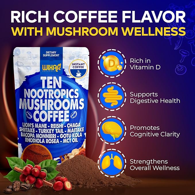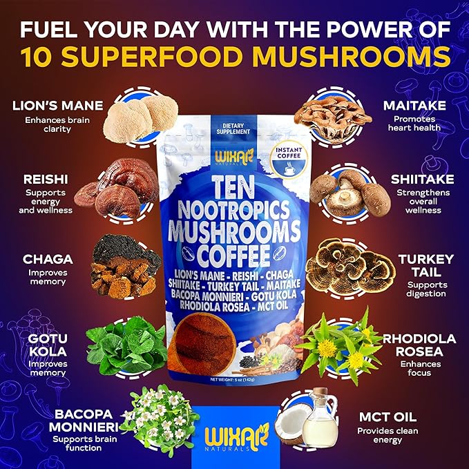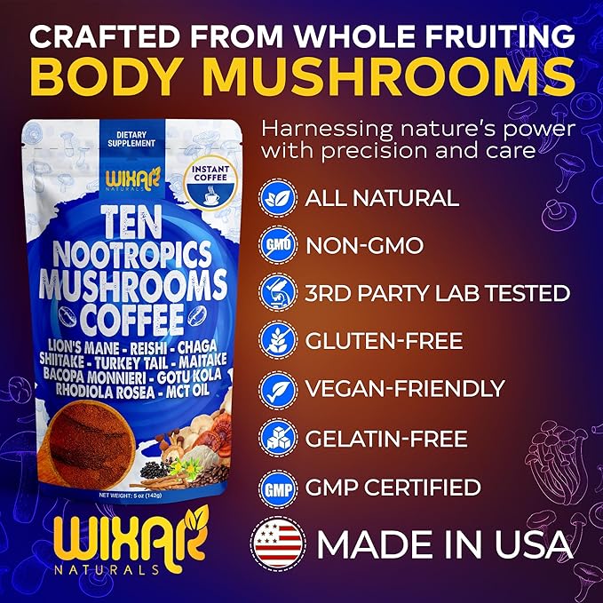 - SUPERFOOD 10-MUSHROOM BLEND, LOW CAFFEINE : Focus & Energize your day with Wixar Nootropics Mushroom Coffee, featuring 10 powerful superfood extracts like Lion’s Mane, Turkey Tail, Reishi, Chaga, Shiitake, and more. This mushroom instant coffee supports cognitive function, overall health, and mental clarity, while keeping your energy balanced.