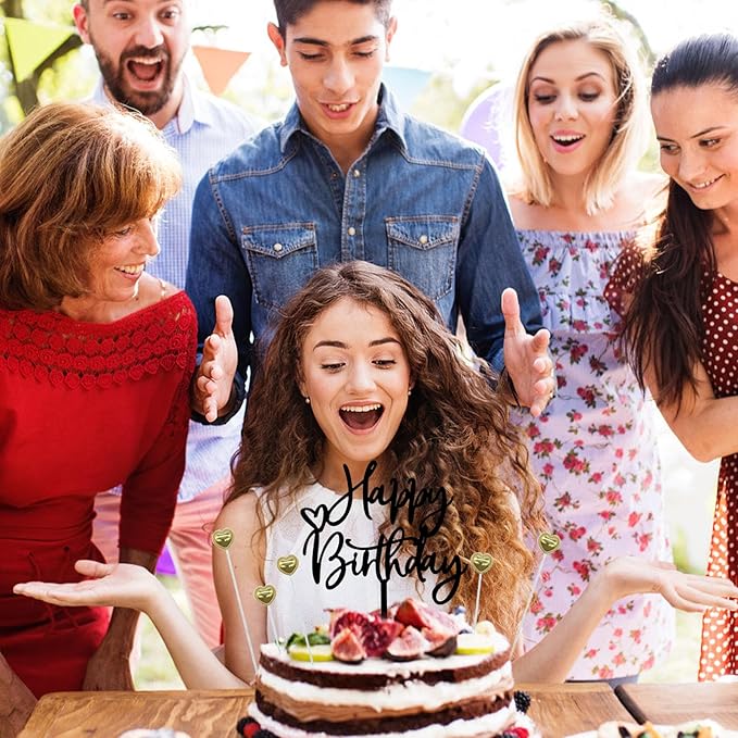 ZHENGYE Set of 1 Black Acrylic Happy Birthday Cake Topper And 5 Pieces Gold Heart-Shaped Cupcake Topper Cake Decoration Supplies for Baby Shower Birthday Decorations(Black 16)