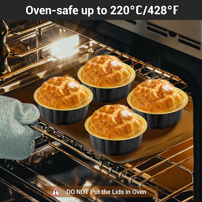 - 【 Aluminum Foil】-Made from sturdy thick aluminum foil with mooth surface, enables our ramekin cups with faster heating than regular baking cups.