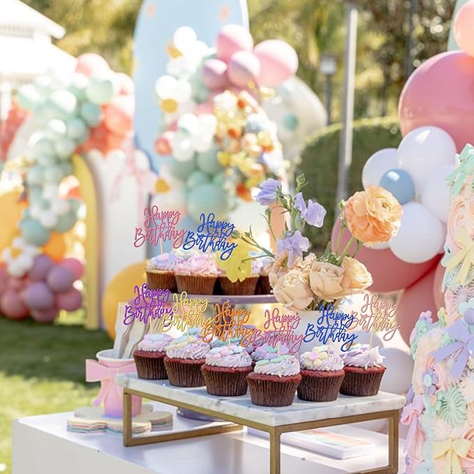 24 PCS Happy Birthday Cupcake Toppers - Multi 6 Colors Glitter Picks for Celebrating Anniversary Theme Party Cake Decorations Supplies