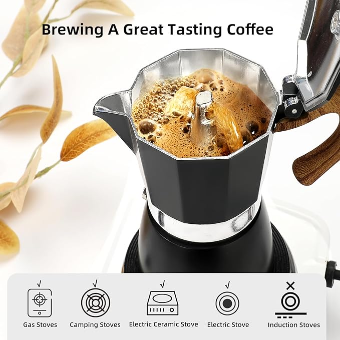 - Premium Quality Design: This espresso pot features a durable, food-grade cast aluminum body and a classic Italian design that ensures fast, even heat distribution for rich, velvety coffee flavor. A built-in safety valve regulates the pressure inside the pot to extract more caffeine. This espresso pot is designed with a heat-resistant handle, lid knob and built-in spout for easy pouring.