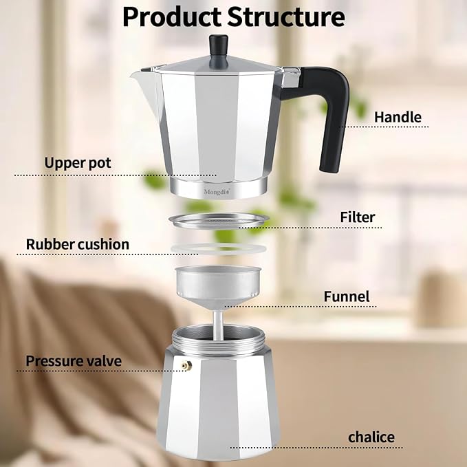 - Premium Quality Design: This espresso pot features a durable, food-grade cast aluminum body and a classic Italian design that ensures fast, even heat distribution for rich, velvety coffee flavor. A built-in safety valve regulates the pressure inside the pot to extract more caffeine. This espresso pot is designed with a heat-resistant handle, lid knob and built-in spout for easy pouring.