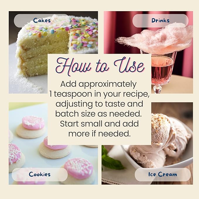 - APPLICATIONS: Just one teaspoon of our cotton candy flavor can infuse the sweet and fruity taste into your ice cream, baking, desserts, beverages, candy, and frostings. It's the perfect cotton candy extract for making cotton candy, cakes, cookies, ice cream, pastries, sauces, and confections.