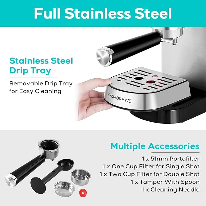 - Make Your Favorite Espresso at Home: The CASABREWS espresso machine lets you enjoy all your favorite espresso drinks at home. From barista-style lattes and cappuccinos to macchiatos, you can now brew them yourself. With its durable stainless steel design, this espresso coffee maker fits perfectly in any kitchen, making it ideal for both home and office use