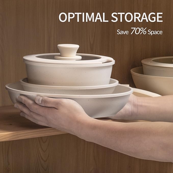 - 4. Stackable and Compact: The non stick pots and pan set ceramic cookware include ceramic frying pan with lid Save up to 75% more space with stackable pots and pans set and detachable handles,ceramic pans and ceramic pots allowing for storage in cabinets or RVs.