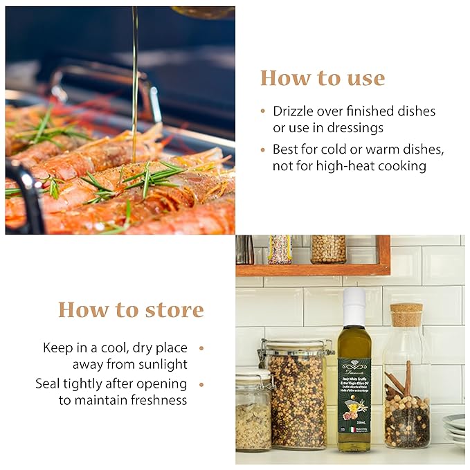 - How to use: Drizzle over risottos, pastas, roasted vegetables, or creamy mashed potatoes just before serving. A few drops go a long way—use this white truffle oil as a finishing oil to enrich flavor, not for cooking or frying.