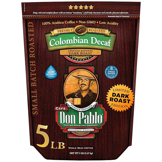 Don Pablo Colombian Decaf - Limited Edition Dark Roast Gourmet Coffee, Swiss Water Process Decaf, 100% Arabica Whole Bean, Non-GMO, Low Acidity, 5 Pound (5 lb) Bag