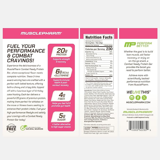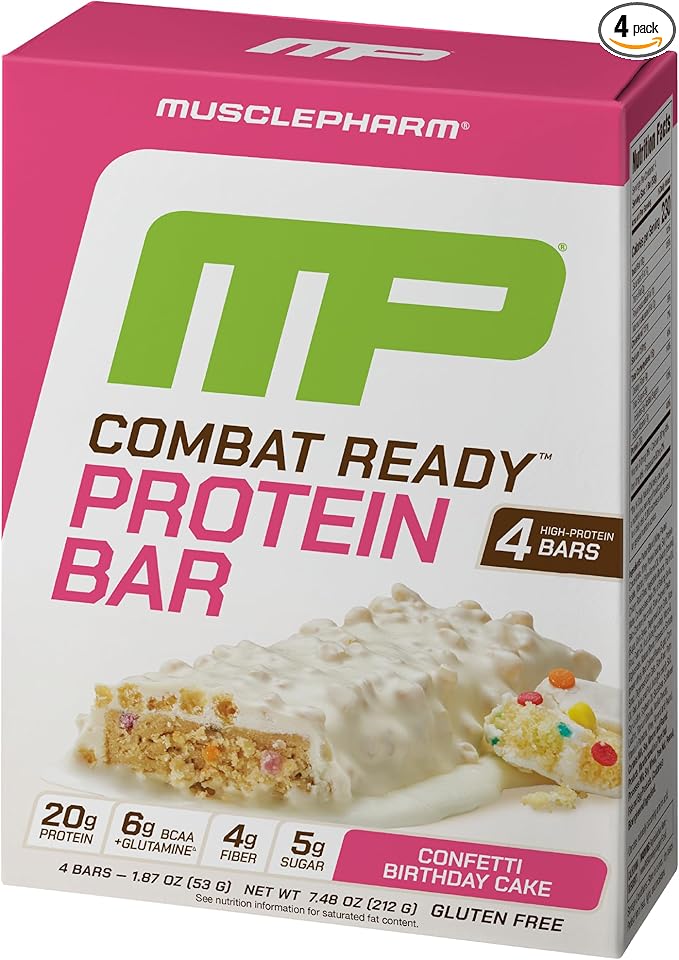 - Nutrition Facts: Includes 4 Combat Ready Protein Bars, each offering 20g Protein, 4g Fiber & 230 Calories, Gluten Free protein bars, Confetti Cake Flavor.