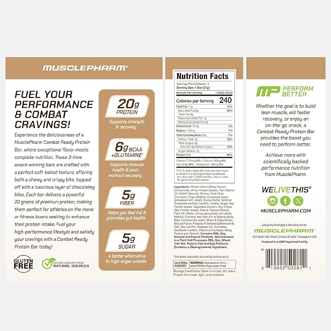 - Fuel Performance & Combat Cravings: Indulge with an award-winning MusclePharm Combat Ready Protein Bar and its combination of superior taste and balanced nutrition. Packed with 20 grams of premium protein to fuel the energy demands of a high-performance lifestyle, meet protein needs and combat cravings.