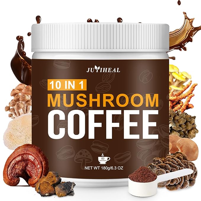 JUYIHEAL Mushroom Coffee, 10 in1 Mushroom Powder Coffee with Lions Mane, Chaga, Reishi, Cordyceps, Maitake, Shiitake, and Turkey Tail for Energy, Focus, Immune Support, 180g