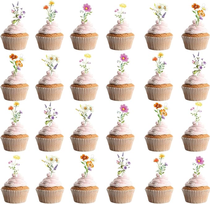 48 Pcs Wildflower Party Cupcake Toppers for Floral Birthday Baby Shower Party Decorations