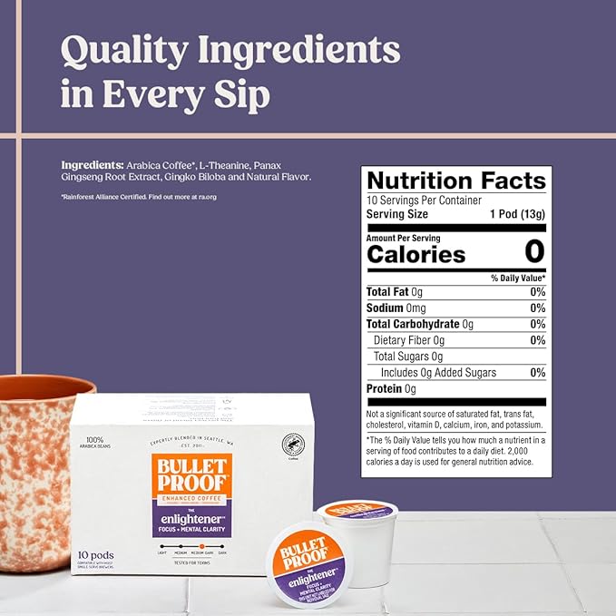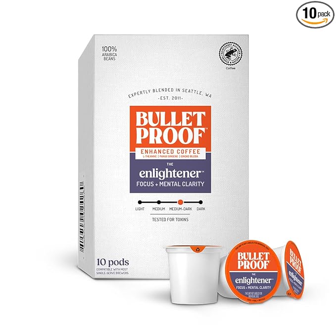 - Mental Clarity & Focus: Contains one box of 10 Bulletproof Enlightener Enhanced coffee pods (10 Count Total) a medium-dark roast with adaptogenic herbs and antioxidants for mental clarity, focus and memory support