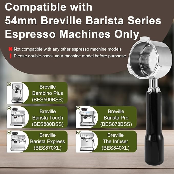 - COMPATIBLE MODELS - Designed with a 54mm diameter, this portafilter fits 54mm Breville Barista Series models, including the Breville Barista Express, Pro, Touch, Bambino Plus, Infuser (880BSS, 870XL, 878BSS, 500BSS, 840XL)