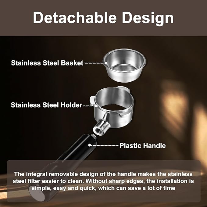- HIGH-QUALITY MATERIALS - Crafted from food-grade stainless steel and featuring an ABS plastic handle, this portafilter combines durability with comfort. The ABS handle has a smooth exterior for a comfortable grip, while the stainless steel resists oxidation, corrosion, and rust, ensuring long-lasting performance