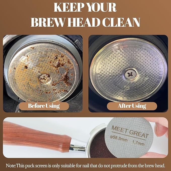 - KEEP THE BREW HEAD CLEAN: Our espresso filter can effectively separate the coffee powder from the machine head, helping maintain the brewing head cleanliness and making cleanup a breeze, save cleaning time. If there are protruding screw in your brewing head, we do not recommend to use the puck screen.