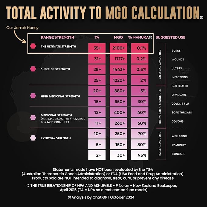 - ✔ YOUR HONEY SUPERHERO: Sourced from the pristine wilderness of Western Australia, Jarrah Honey has a bio-activity rating of TA35+ which is equivalent to Manuka Honey MGO 2100+ (Lab Tested in NZ to higher TA50+ ~ MGO 3700+), making it a premium alternative to New Zealand Manuka Honey. It supports digestive health, promotes prebiotic activity, and it can help with wound care with its honey properties.
