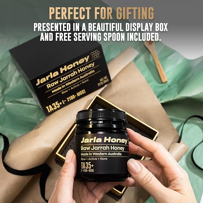 - ✔ PREMIUM QUALITY & VALUE: Jarla Honey Jarrah Honey delivers exceptional value at up to 8x lower cost than the best of the best Manuka Honey. Each Jarla Jarrah honey pack includes a bamboo spoon and comes in a beautifully designed gift box, making it an excellent choice for gifting or personal use.