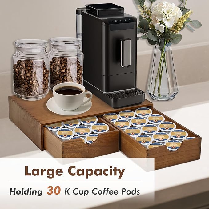 Wooden K Cup Organizer Coffee Pod Storage Box - K Pod Holder with Two Drawers, K Cup Drawer Under Brewer and Coffee Maker Machine Stand, 30 Pod Capacity, Style A ??,<div>