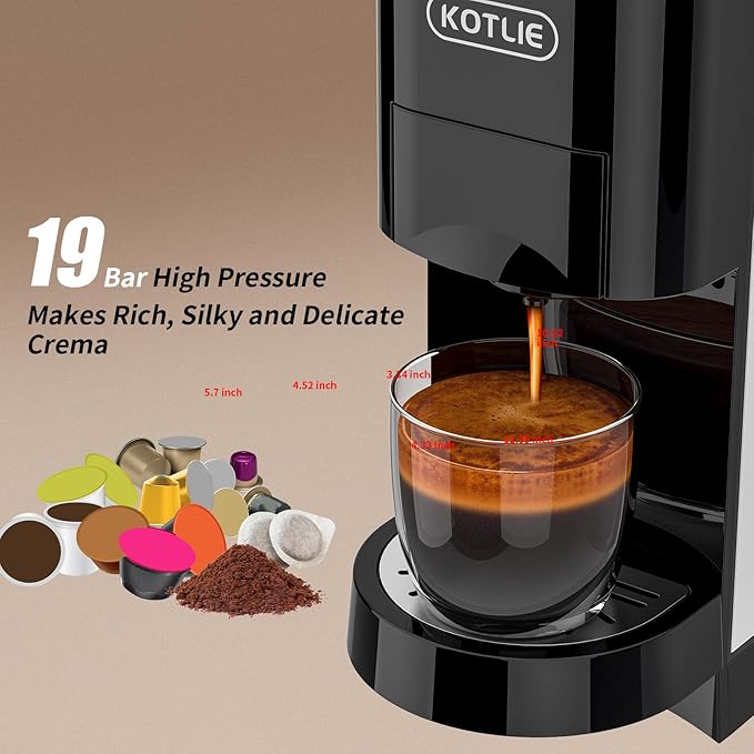KOTLIE 19Bar Single Serve Coffee Maker, 5in1 Espresso Machine for Keu* kcup Capsules/Nespresso Original/Dolce Gusto/Ground Coffee/44mm ESE, Level 7 Water volume, Hot&Cold Brew Coffee Machine