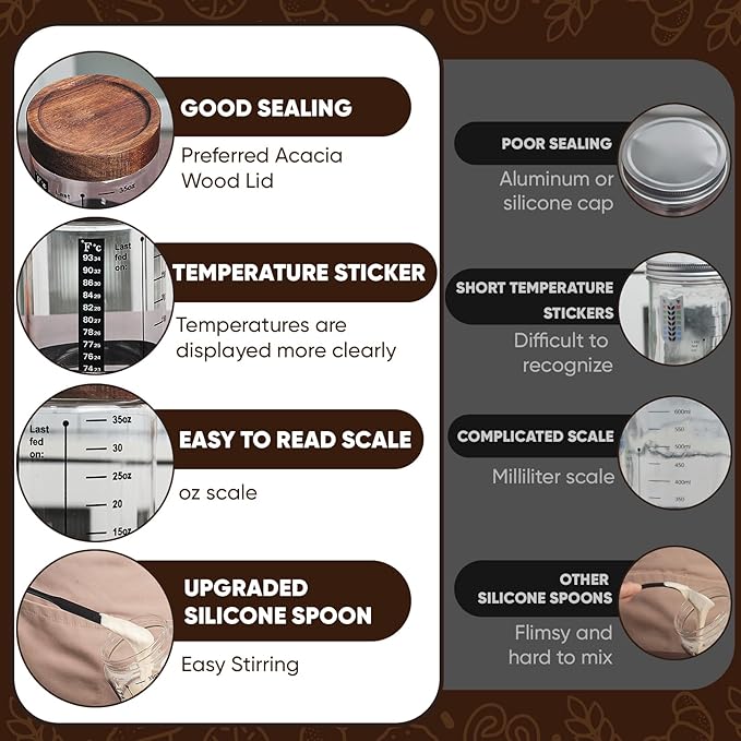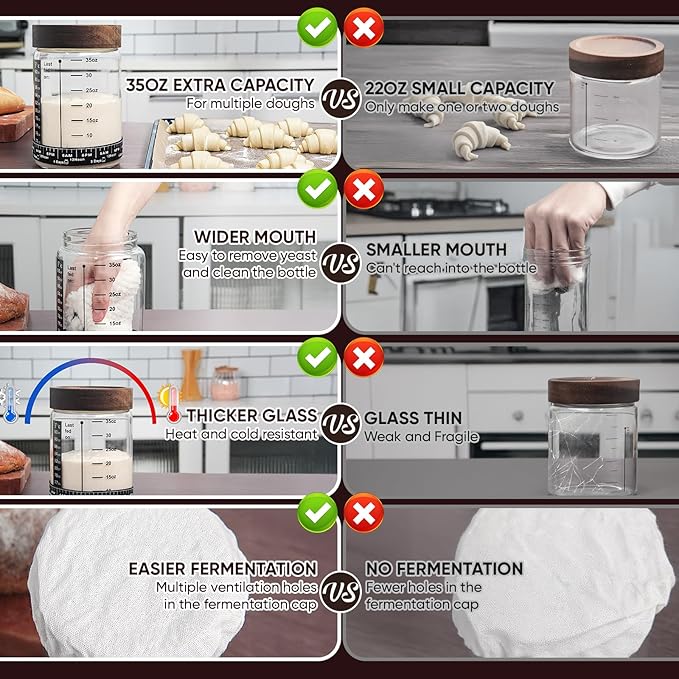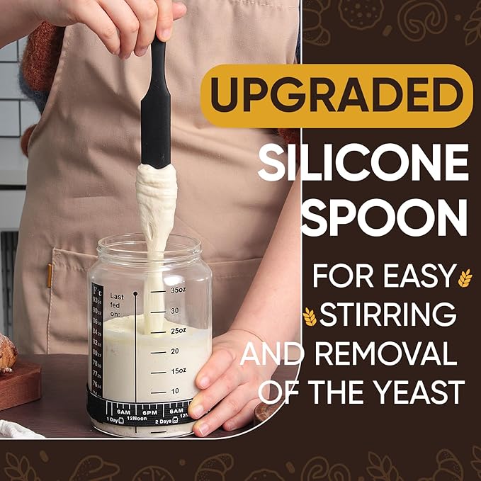 - 【Enlarged and Wider】 The new wide-mouth design makes it easy to reach inside the bottle to access the dough or to wipe it down for cleaning. 35OZ capacity is large enough to ferment multiple doughs at the same time to satisfy the whole family's cravings for all kinds of baked goods. In addition, the food-grade silicone spatula has been upgraded and is not easy to bend, so it can be used for mixing dough.