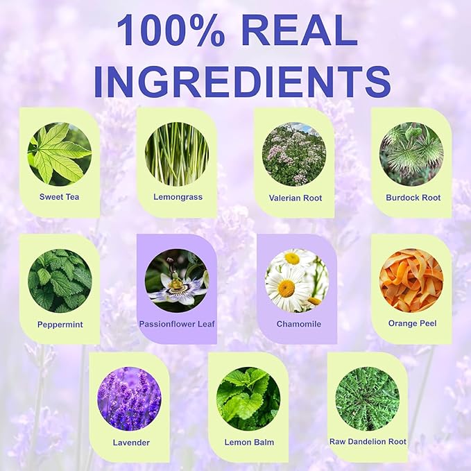 - 【Real Ingredients】Nighty Herbal Tea Bags are carefully blended with passionflower leaf, chamomile, lemon balm, spearmint, dandelion root, sweet tealeaf, orange peel, lemongrass, valerian root, lavender, peppermint -- All of these herbs are caffeine free!
