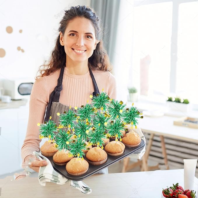 Rsstarxi 30 Pack Foil Firework Cupcake Toppers Birthday Sparkle Tinsel Drink Cake Decorations Cocktail Picks for New Years Valentine's Day Birthday Wedding Graduation Party Decorations Green