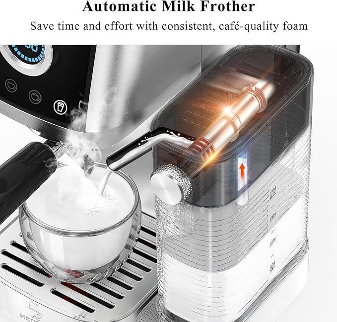 - Semi-auto cappuccino machine with automatic steams silky foam—no skill needed. Ergonomic 15.6 degree touchscreen for precision control. Space-saving enough for small spaces on counter. Sleek stainless steel body easy to clean, works for daily needs.