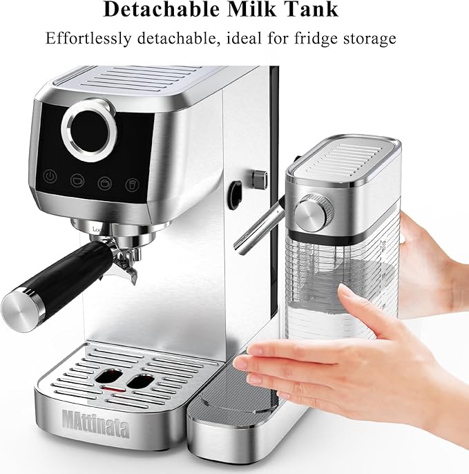 - This semi-automatic espresso machine with milk tank features a removable water tank for easy refilling. Includes one-cup filter, two-cup filter, 51mm portafilter, tamper with spoon, and an easy-to-follow manual. Ideal for beginners! Any product issues, feel free to contact MAttinata via amazon message center, Notes: Click “Sold by MAttinata” on product listing page > ask a question > an order I placed/select a subject > send message