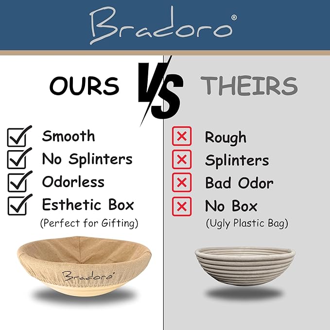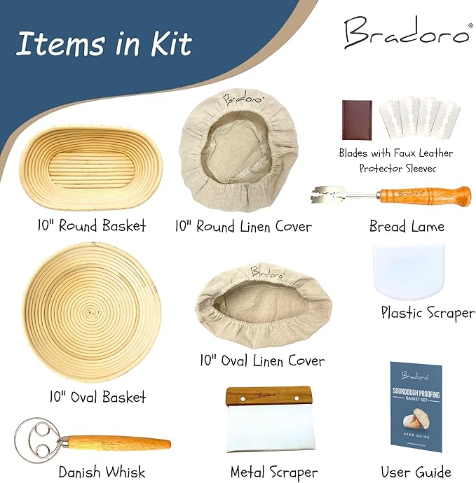 - ππππ πͺππ§π ππ’π‘πππππ‘ππ β Our 10-piece bread making kit includes: one 10β round banneton basket, one 10β oval banneton basket, a bread lame with 4 blades, whisk, metal scraper, plastic scraper, and two linen covers. These essential sourdough tools make it easy to craft bakery-quality loaves from your own kitchen. We back it with a 100% satisfaction guarantee and responsive customer support.