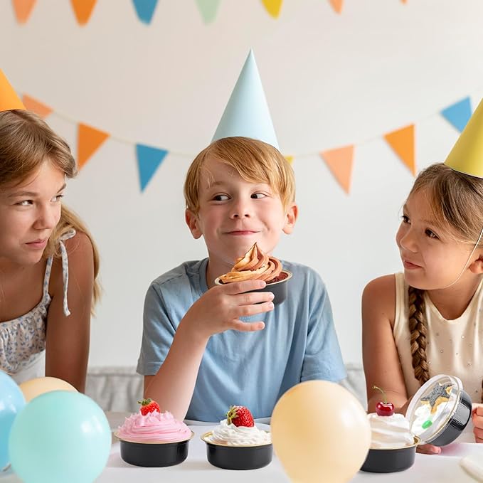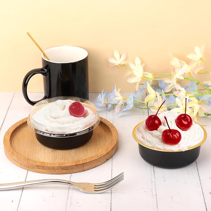 Beasea Disposable Ramekins with Lids, 100 Pack 8.8oz 260ml 4 Inch Round Aluminum Foil Cups Disposable Cupcake Pudding Mini Baking Cups for Party - Black Gold