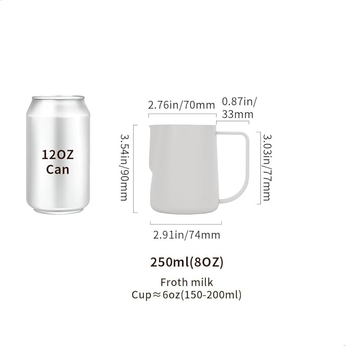 - PORTABLE CAPACITY: 8oz/250ml stainless steel milk frothing pitcher is perfect for 1 cup. Small steamer jug effectively save milk and avoid waste for one serving. Suitable for cups or glasses with a capacity of 200ml or less. Perfect for making coffee like dirty white. Measurement scale inside can help you control the amount. Max capacity is around 10oz.