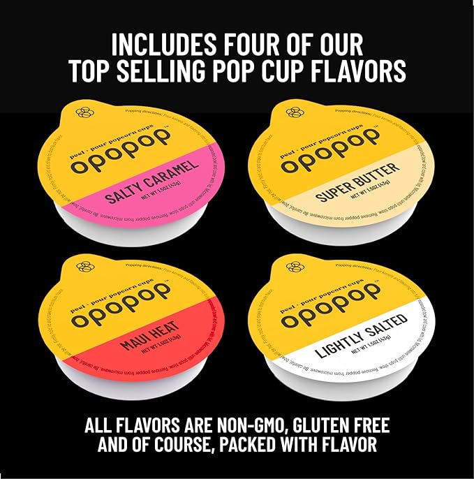 - SUPREMELY SNACKABLE: Our microwavable popcorn snack pack is the perfect treat with 4 new flavors - Lightly Salted, Salty Caramel, Super Butter and Maui Heat. The pop cups are the perfect size for an office snack, after school treat, or a movie night at home.