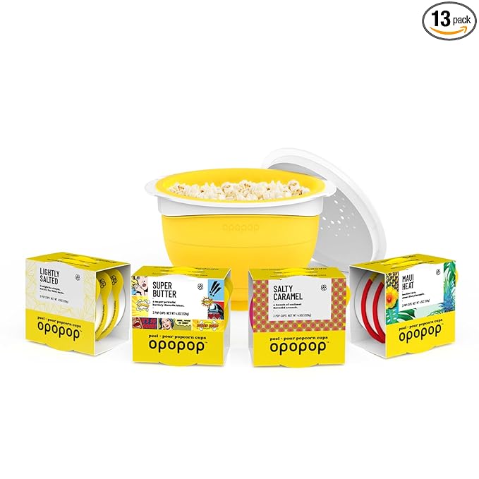 - THE POPCORN REVOLUTION: Opopop’s mission is to liberate you from boring popcorn, so start your journey with us by trying this delicious microwave popcorn bowl set. It includes our collapsible silicone microwave popcorn popper and a 12-pack of gourmet flavored popcorn cups in 4 different flavors.
