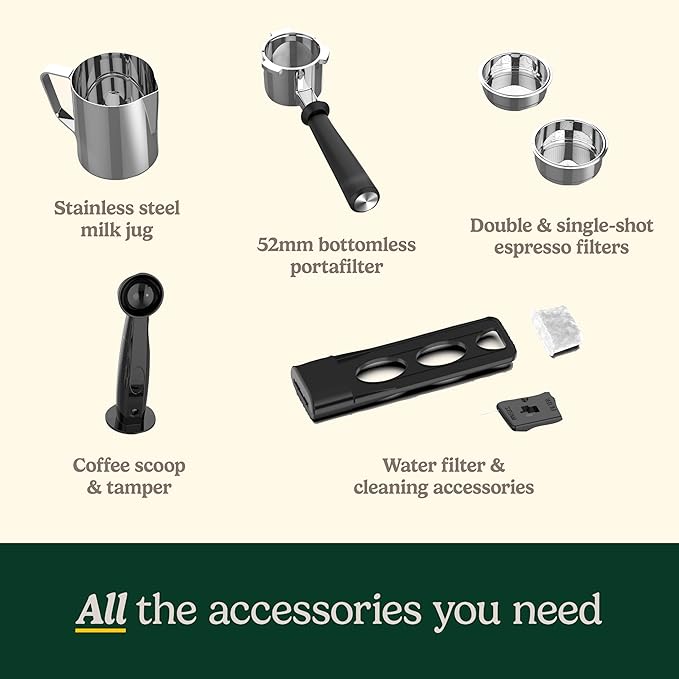 - Accessories included: Stainless steel milk jug, single shot espresso filter, double shot espresso filter, coffee scoop & tamper, and steam wand cleaning pin