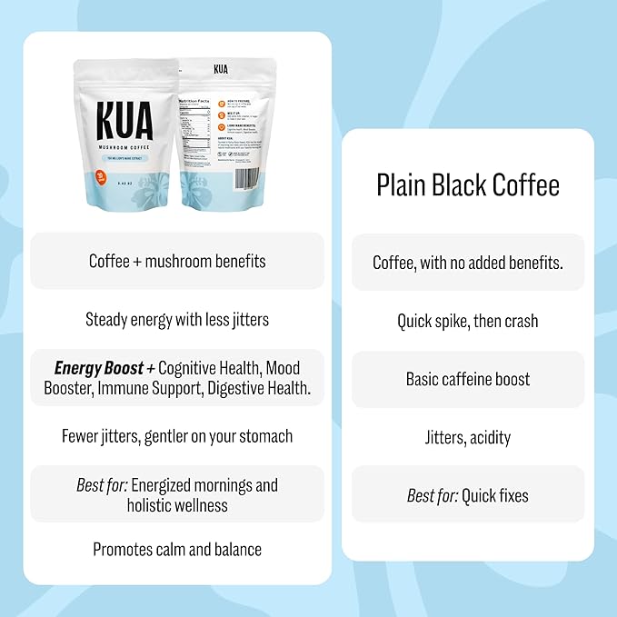 - RELAXATION: With just the right blend of caffeine and lions mane mushrooms KUA Mushroom Coffee provides a calm and focused mentality to start your day. With no crash or jitters this mushroom coffee is your daily morning drink to start your day off right with the perfect blend of lions mane mushroom and instant coffee.