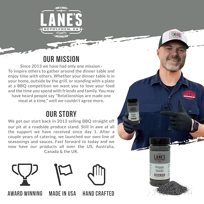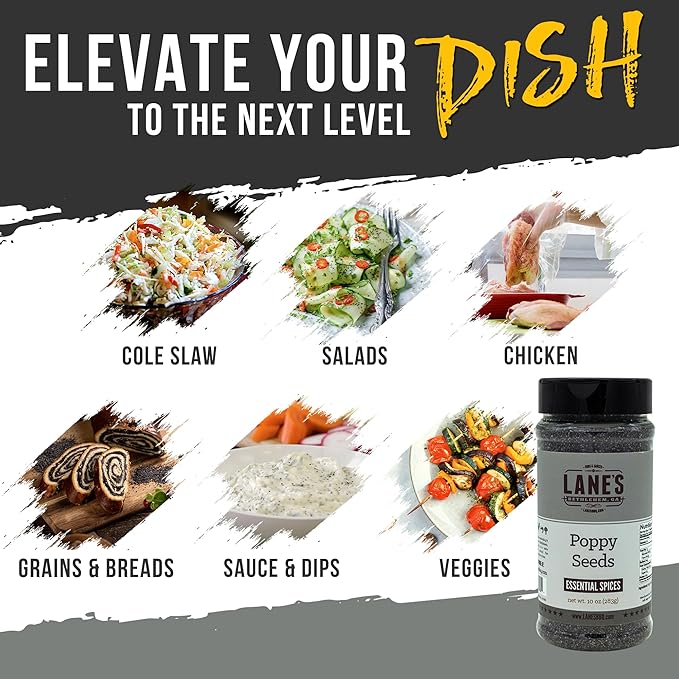 - CHOOSE LANE'S POPPY SEED SPICE SEASONING FOR ANY OCCASION. Our poppyseed for baking comes in a 10oz (283g) bottle, handcrafted and made in the USA. Perfect for individuals who enjoy cooking and baking to elevate their dishes to the next level.