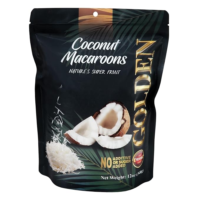 - PURE & WHOLESOME: Golden Premium Quality Coconut Macaroons offer a truly natural snack experience. Made from 100% pure coconut, these macaroons contain no additives or sugar, allowing you to enjoy the wholesome flavor of fresh, carefully selected coconuts. With their simple yet nutritious composition, they provide an authentic, guilt-free snacking option that’s both delicious and satisfying.