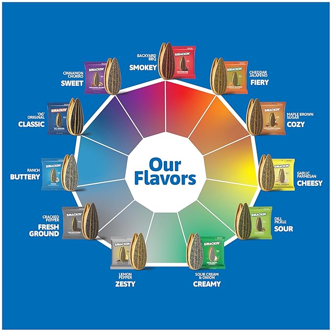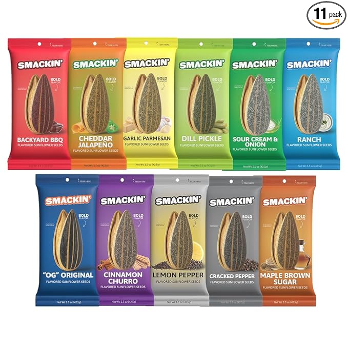 - GET SMACKIN': The classic sunflower seed reimagined with bold flavors, jumbo sunflower seeds and no more salty burn. Every small-batch of hand crafter sunflower seeds is coated in gourmet seasoning and finished with a signature roast.