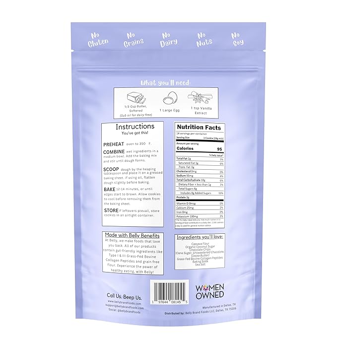 Belly Chocolate Chip Cookie Mix with Collagen Protein | High-Protein | Soft & Chewy Cookies | Grain-Free Dairy-Free Nut-Free | Healthy Snacks For Adults & Kids | Women-Owned Business | 10.5 oz | 3 Pack