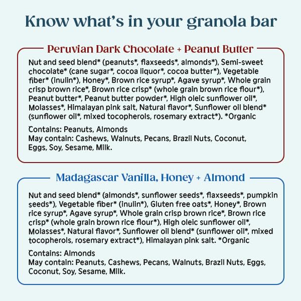 - IRRESISTIBLE NUT & SEED DUO: Treat your taste buds to a symphony of flavor and nutrition with two mouthwatering flavors: Madagascar Vanilla Honey Almond and Peruvian Chocolate. Each bar is a deliciously balanced snack for any time of day.