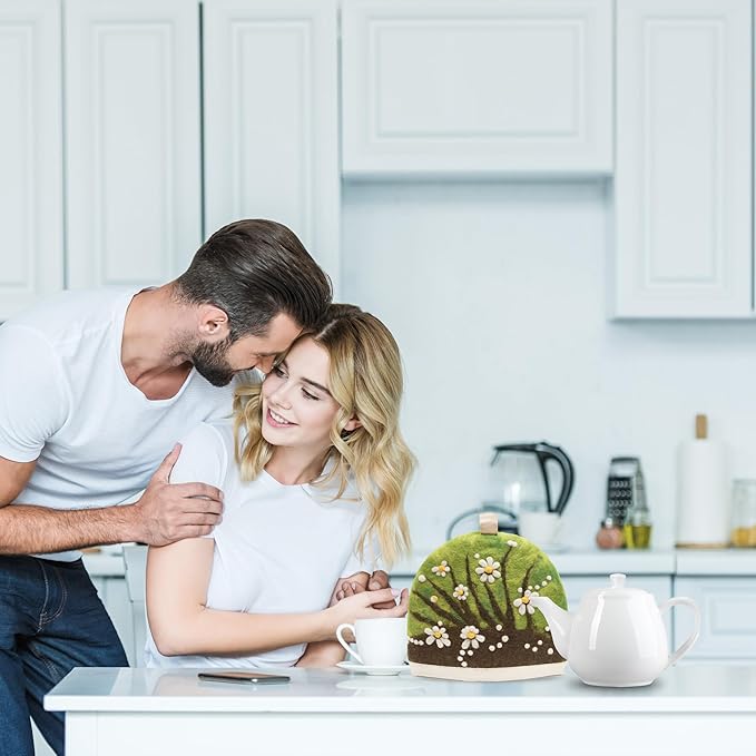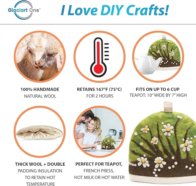 - 🍵 HAND CRAFTED & DURABLE: Using needle felting process, high quality workmanship from Nepal produces these tea cozys which will not tear apart or bleach like polyester. The flower pattern adds charm to your kitchen & is complete with convenient handing loop.